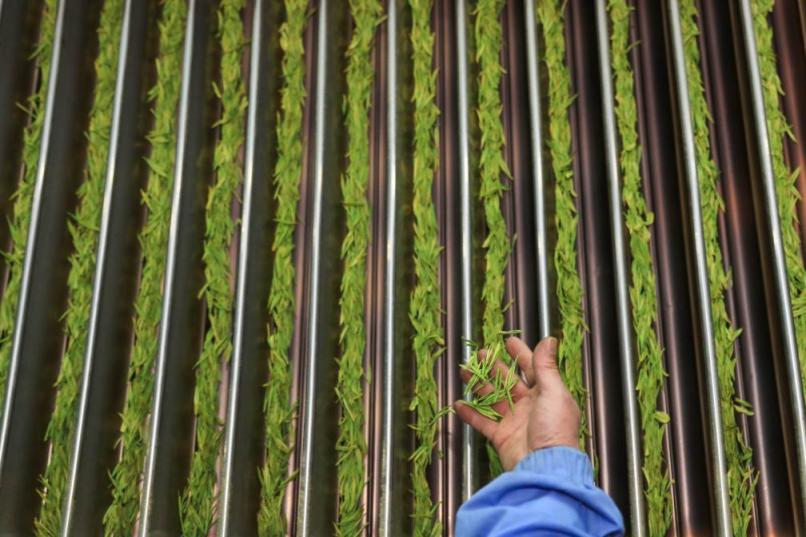 工人在贵州省铜仁市江口县怒溪镇骆象村抹茶加工厂对茶叶进行理条(2021年4月10日摄)。新华社发(韩贤普 摄)