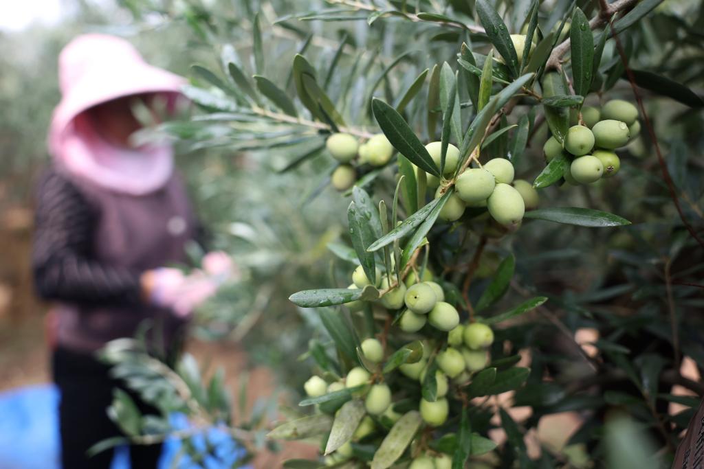 在甘肃省陇南市武都区桔柑镇贺家坪村一处油橄榄种植基地,农户在采摘油橄榄(2024年11月1日摄)。新华社记者 陈斌 摄