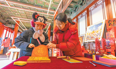 除夕,游客在庆成宫后殿的文创空间里拓印“福”字。张武军摄