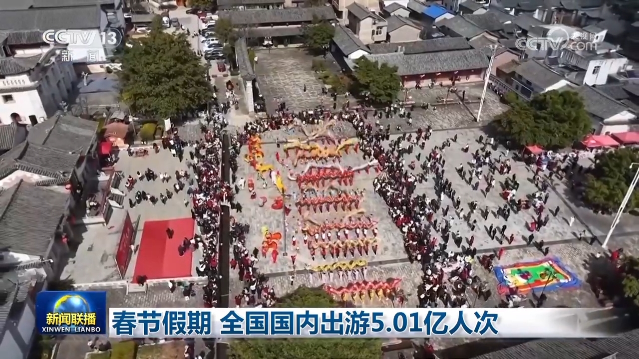 央视网消息(新闻联播):今年春节假期,文化和旅游市场保持高位运行,国内出游5.01亿人次,创历史新高。