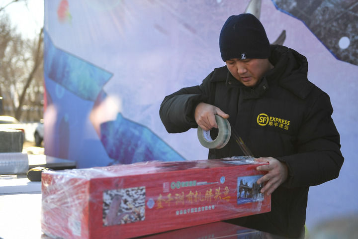 2024年12月27日,快递员在查干湖渔场将鱼打包准备发货。新华社记者张楠 摄