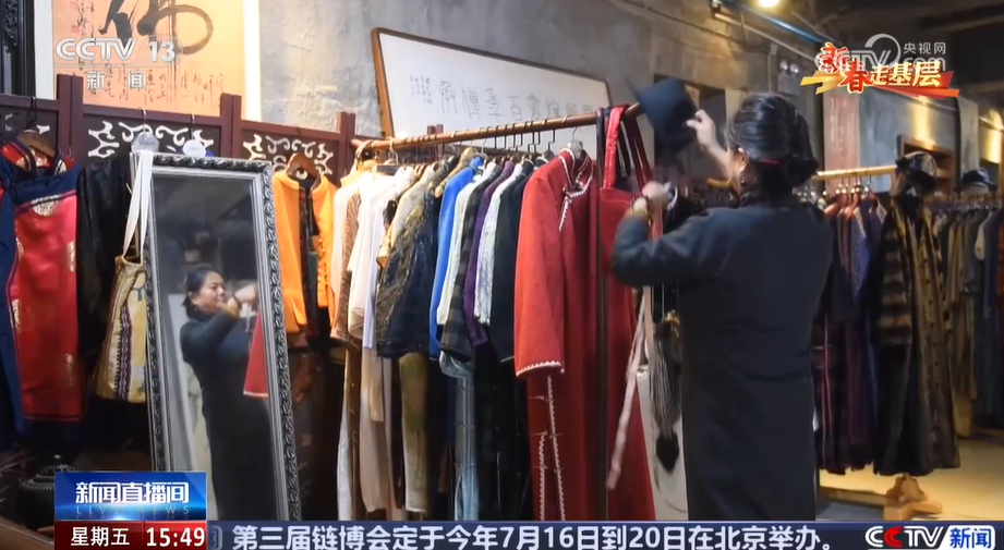 进店的“敲锣打鼓迎宾客”仪式特别又隆重。店铺里,客人们正在试穿新衣。
