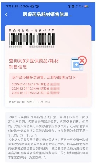 界面如提示“查询到多次医保药品/耗材销售信息”并显示出最近几次的销售记录,该情况说明被查询产品涉嫌多次销售,群众可依据此信息按照《中华人民共和国药品管理法》《中华人民共和国消费者权益保护法》相关条款要求,向销售此药品的定点医药机构索赔。