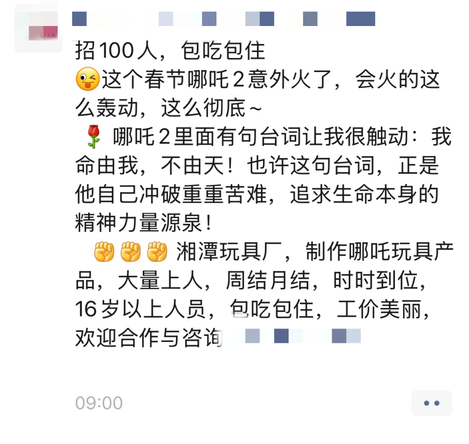 工厂开足马力,招工也正火热。“玩具普工大量上人,我这边先要招100名。”替桑尼森迪招工的周女士告诉记者,招来的工人将负责组装、注塑或包装哪吒玩具,“玩具太火了,厂子随时要人,包吃包住,人到随时可进厂。”