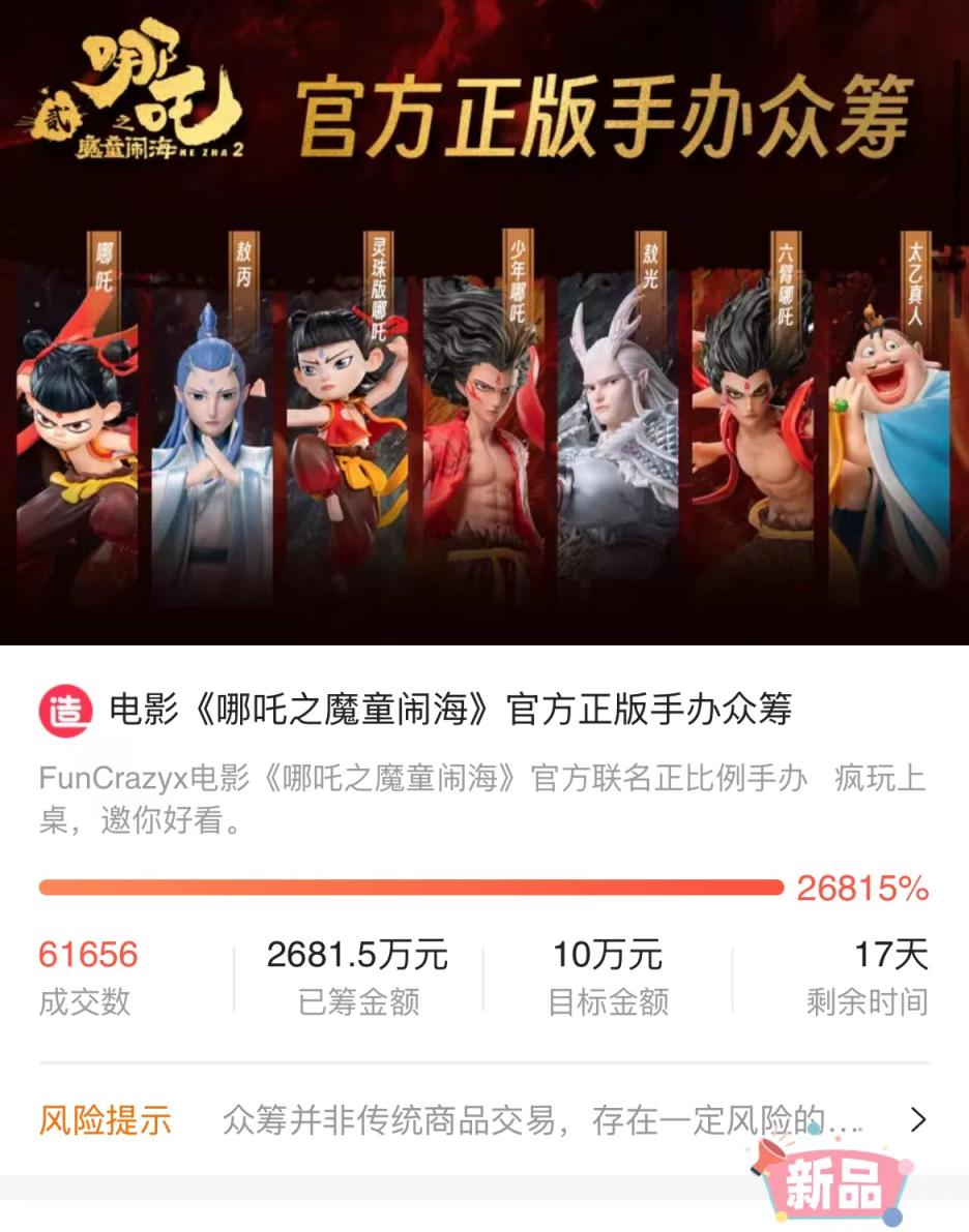 手办众筹项目的筹集资金也一路狂飙。记者注意到,在淘宝众筹上,由FunCrazy和《哪吒之魔童闹海》共同打造的官方正版手办众筹项目,其众筹目标金额为10万元,但截至发稿已达到2681.5万元,完成率达26815%。“请求追加申公豹、石矶娘娘”“能不能出个敖闰”“期待出个四海龙王套”……平台上,超6万名用户出资的同时,纷纷分享着自己对手办设计的期待。