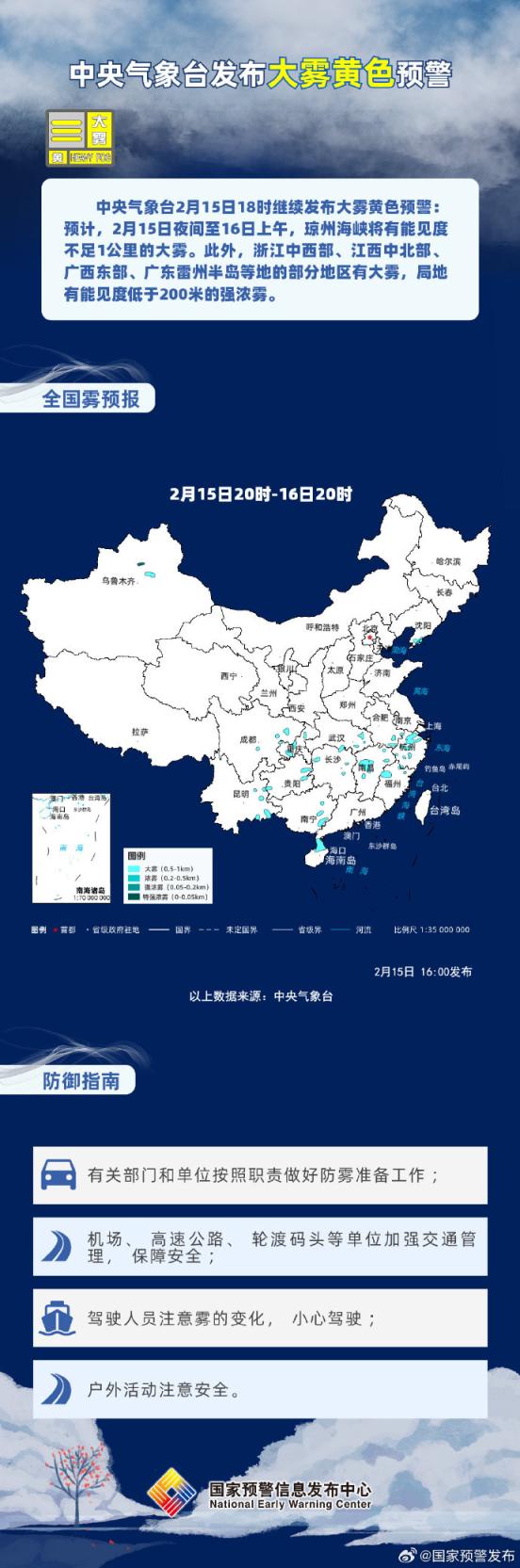 中央气象台2月15日18时继续发布大雾黄色预警: