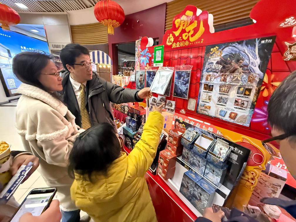 2月14日晚,在北京市海淀区的UME国际影城(华星店),家长带着孩子挑选电影纪念品。新华社记者 才扬 摄
