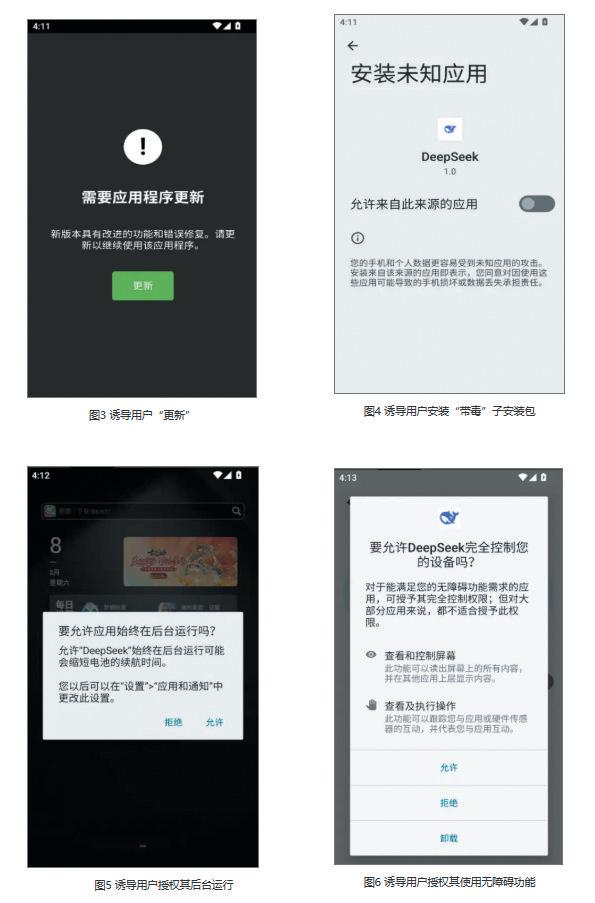 仿冒DeepSeek官方APP的手机木马病毒以及诱导用户安装步骤。 图/国家计算机病毒应急处理中心网站