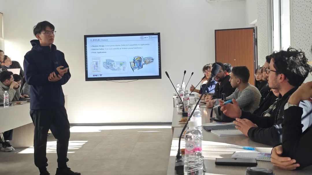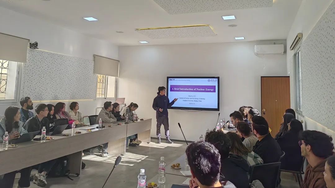 清华大学支队队长田宇、支队成员朱容立、张可欣依次宣讲,介绍了中国核能概况、“一带一路”倡议与中突双边关系、青年全球胜任力三个主题,并分别与突尼斯学生展开交流互动。突尼斯学生积极发言,分享有关核能的发展前景、中突合作以及青年交流等问题的看法和观点,现场气氛热烈而融洽。