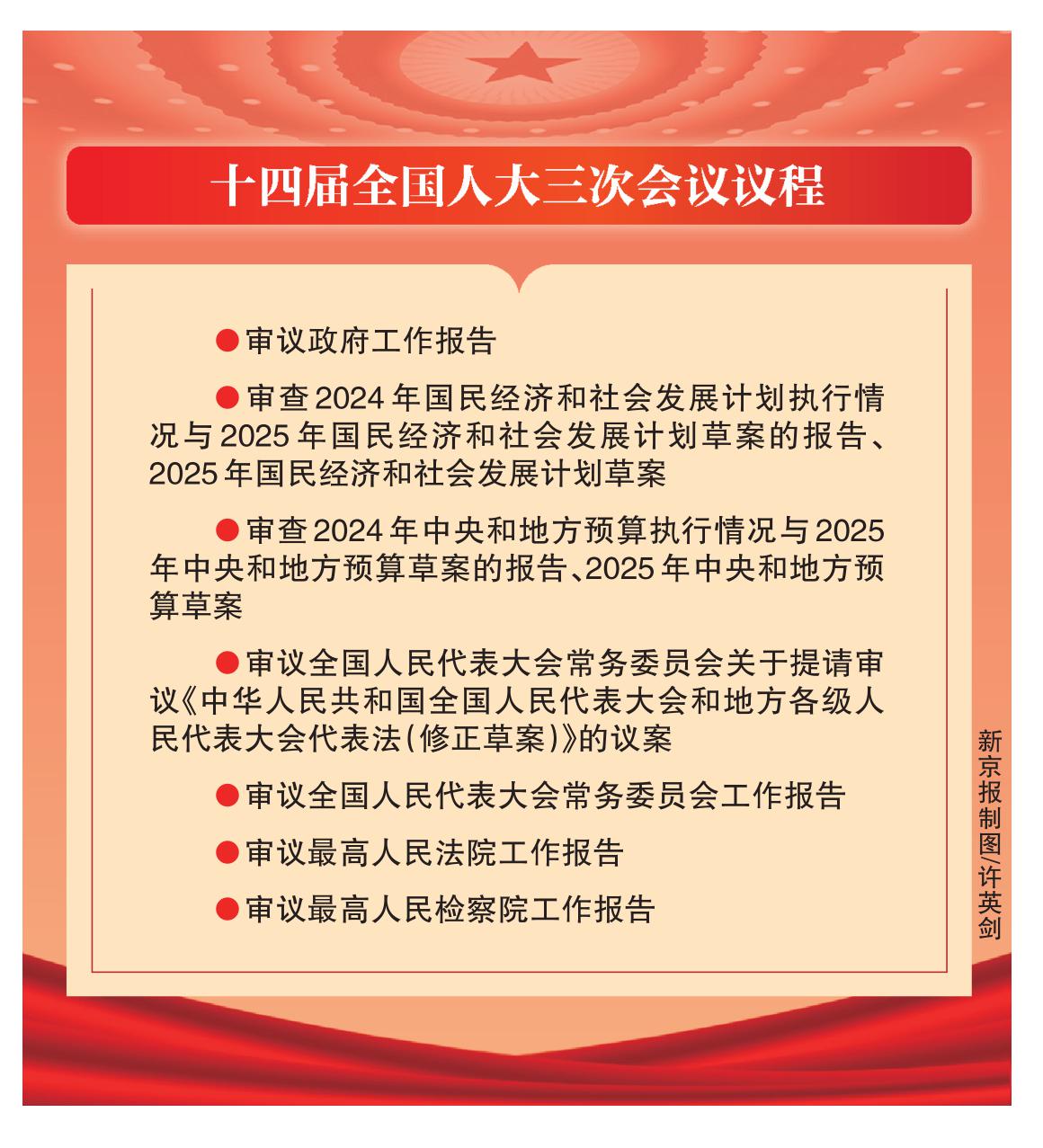 大会议程共有七项,分别为:一、审议政府工作报告;二、审查2024年国民经济和社会发展计划执行情况与2025年国民经济和社会发展计划草案的报告、2025年国民经济和社会发展计划草案;三、审查2024年中央和地方预算执行情况与2025年中央和地方预算草案的报告、2025年中央和地方预算草案;四、审议全国人民代表大会常务委员会关于提请审议《中华人民共和国全国人民代表大会和地方各级人民代表大会代表法(修正草案)》的议案;五、审议全国人民代表大会常务委员会工作报告;六、审议最高人民法院工作报告;七、审议最高人民检察院工作报告。