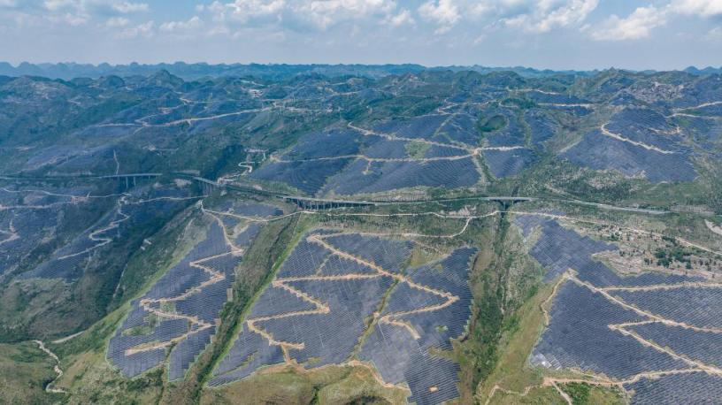 从贵州省关岭布依族苗族自治县新铺镇的一处高地上望去,只见密密麻麻的光伏板顺着山势延伸向远方,一眼看不到头。作为贵州省首个百万千瓦级光伏项目,盘江百万千瓦级光伏基地建设正酣。