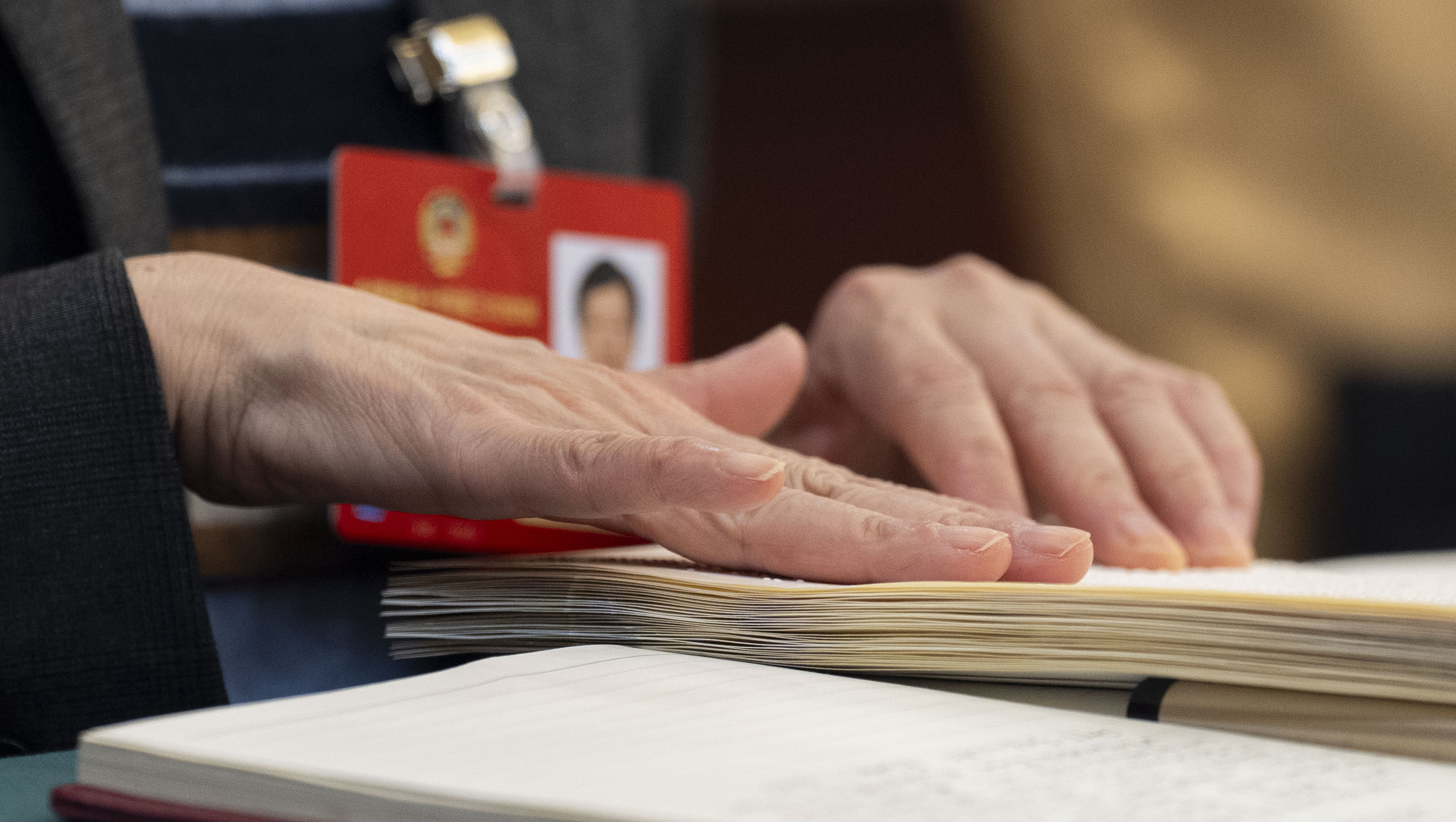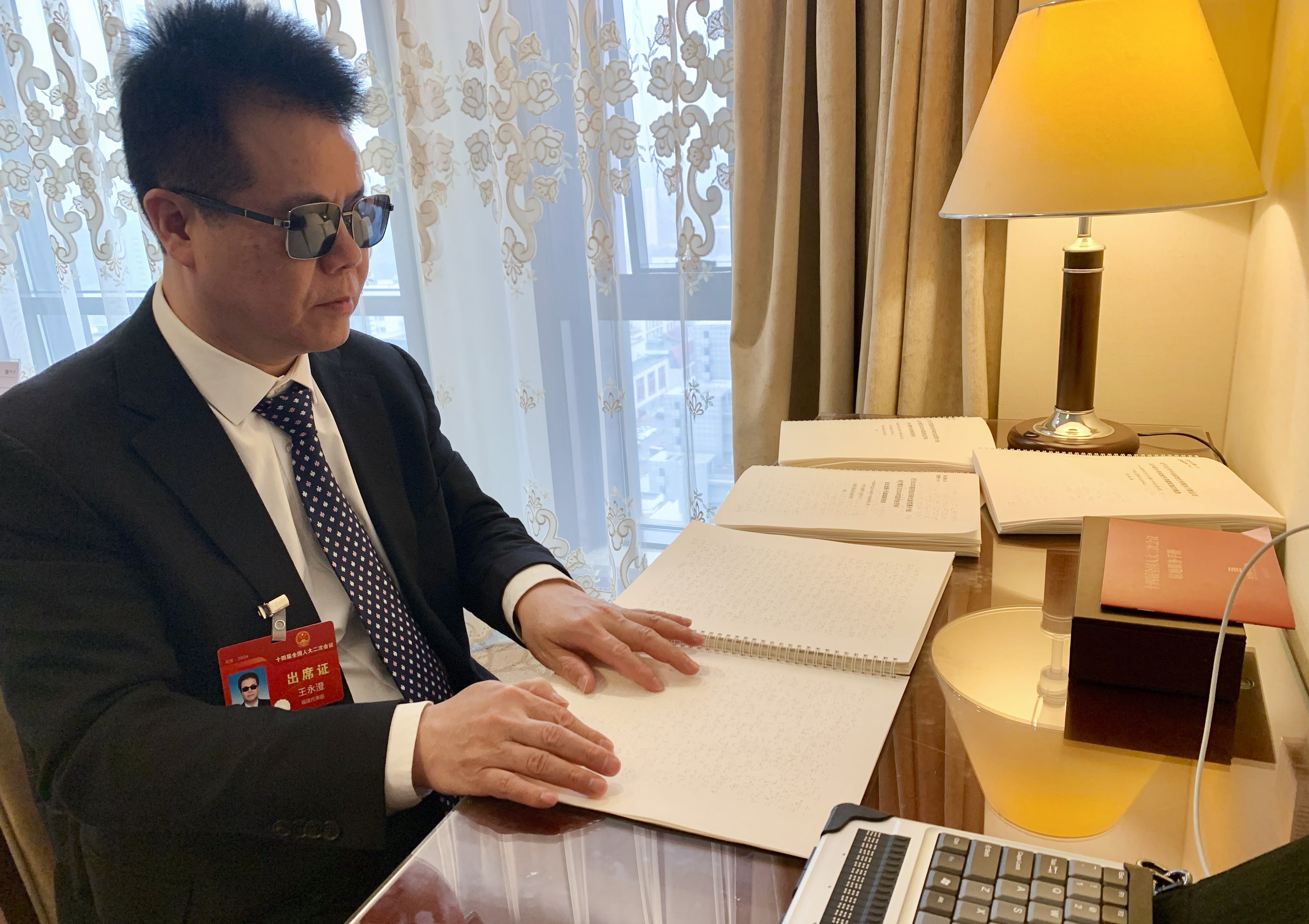 2024年3月5日,在北京的驻地房间内,王永澄代表用手指触摸阅读盲文版政府工作报告。