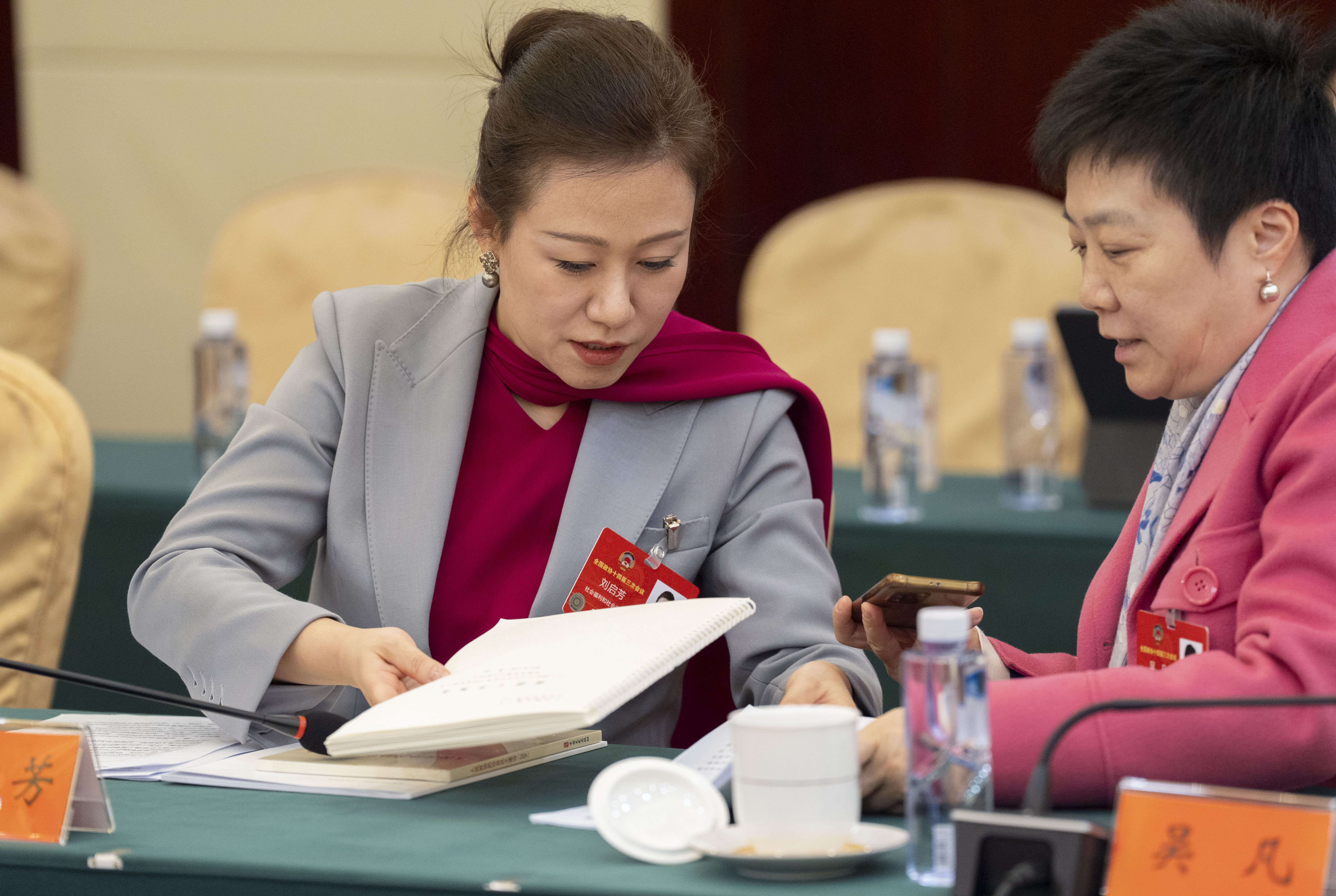 这是3月5日在全国政协十四届三次会议社会福利和社会保障界别小组会议现场拍摄的盲文版政府工作报告(左)和普通版政府工作报告。