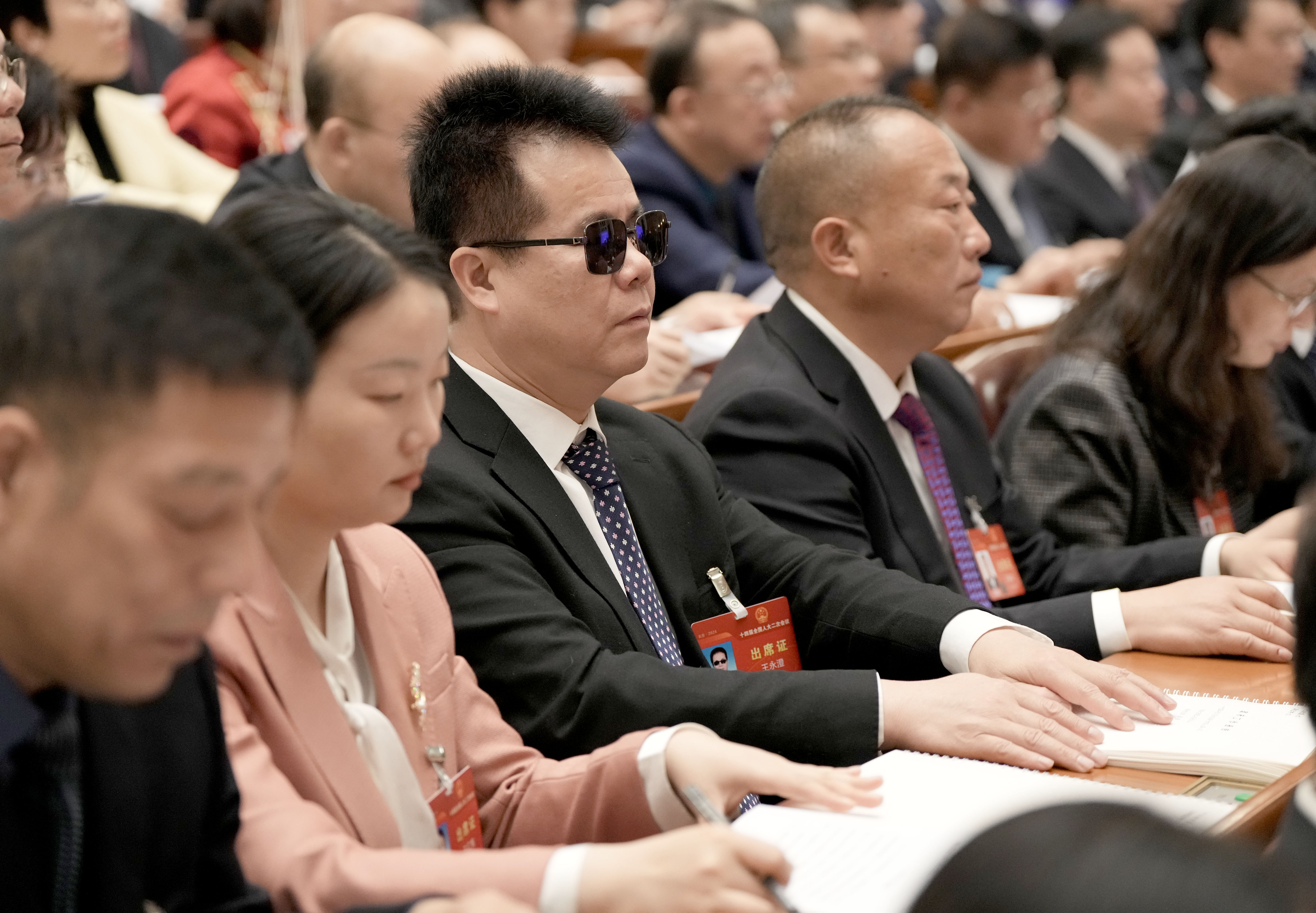 2024年3月5日,在十四届全国人大二次会议开幕会上,王永澄代表(中)用手指阅读盲文版的政府工作报告。