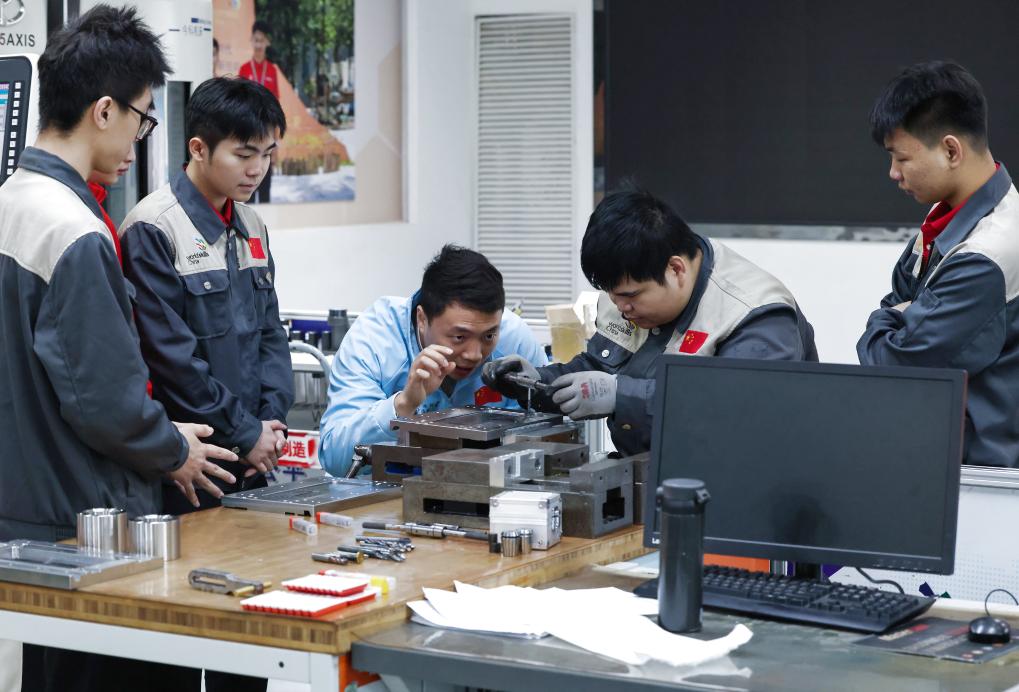 2月25日,在广东省机械技师学院,杨登辉(中)指导学生提升器件加工精度。