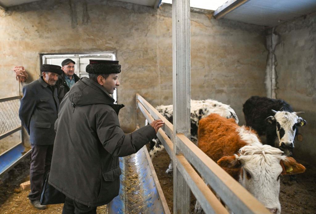 1月3日,在新疆喀什地区塔什库尔干塔吉克自治县瓦恰乡夏布孜喀拉村,多来提曼·开米克在一户村民的棚圈中实地了解牲畜越冬情况。