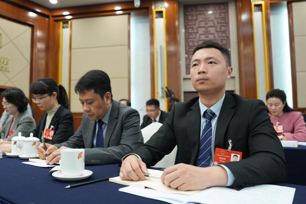 3月6日,杨登辉(前右一)在十四届全国人大三次会议广东代表团全体会议上认真听取发言。