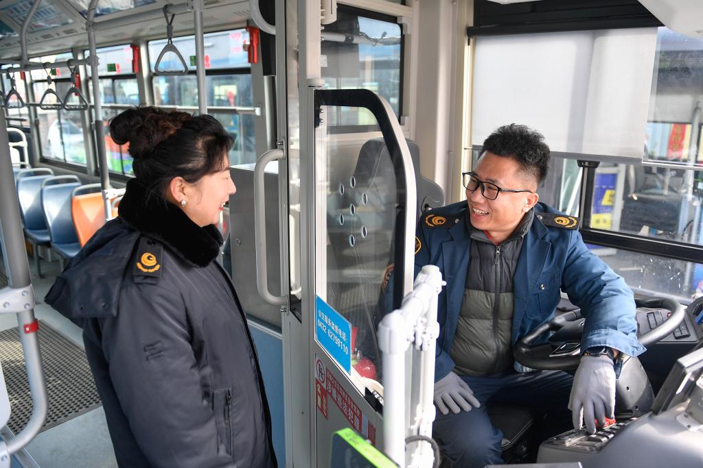 2月25日,在吉林市城市公共交通集团有限公司第四分公司,马秀娟(左)与一名公交车驾驶员交谈。