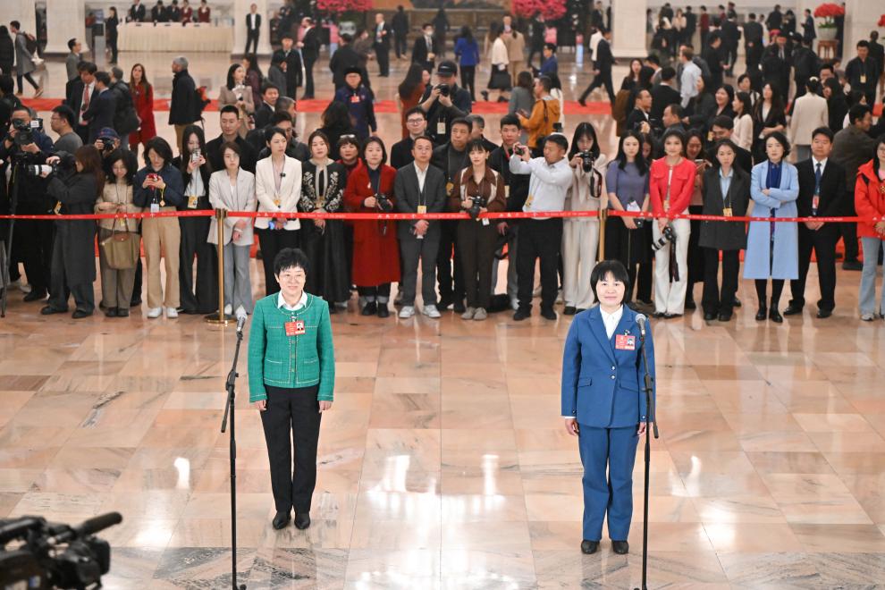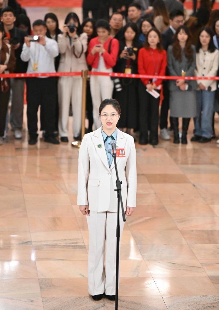 3月11日,第十四届全国人民代表大会第三次会议第三场“代表通道”集中采访活动在北京人民大会堂举行。这是全国人大代表谭新萍接受媒体采访。新华社记者 胥冰洁 摄