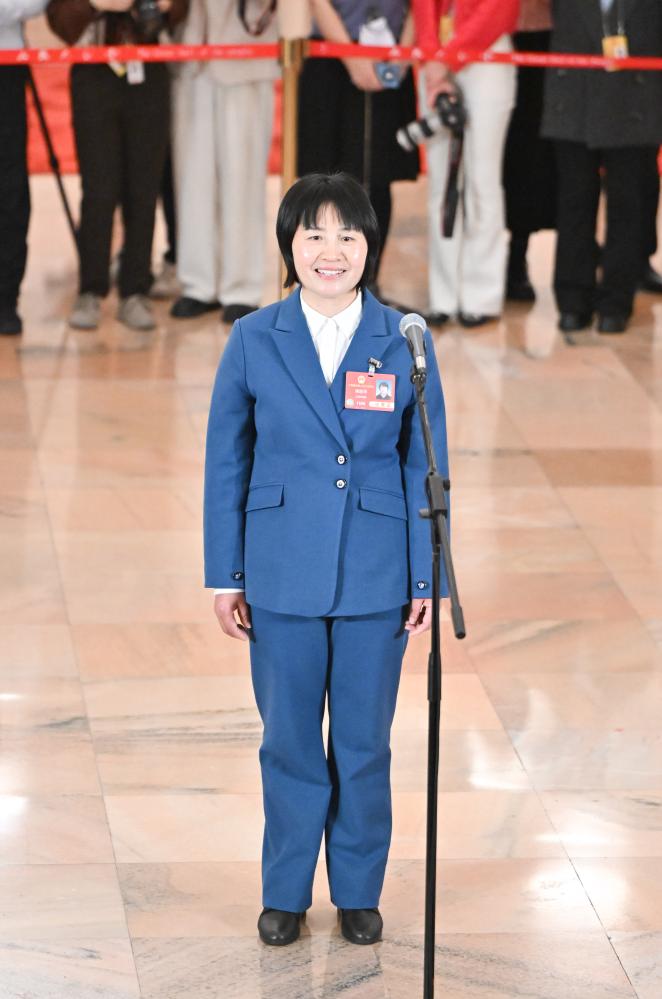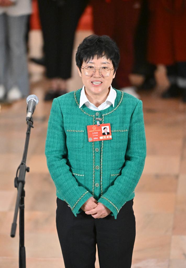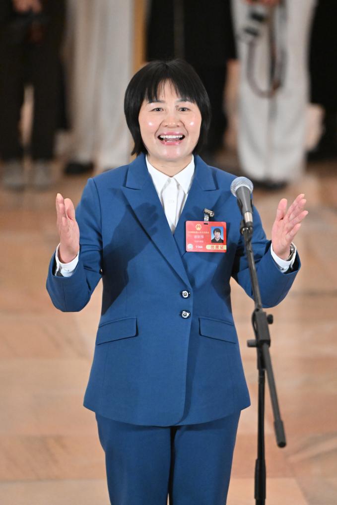 3月11日,第十四届全国人民代表大会第三次会议第三场“代表通道”集中采访活动在北京人民大会堂举行。这是全国人大代表王秀英接受媒体采访。新华社记者 胥冰洁 摄