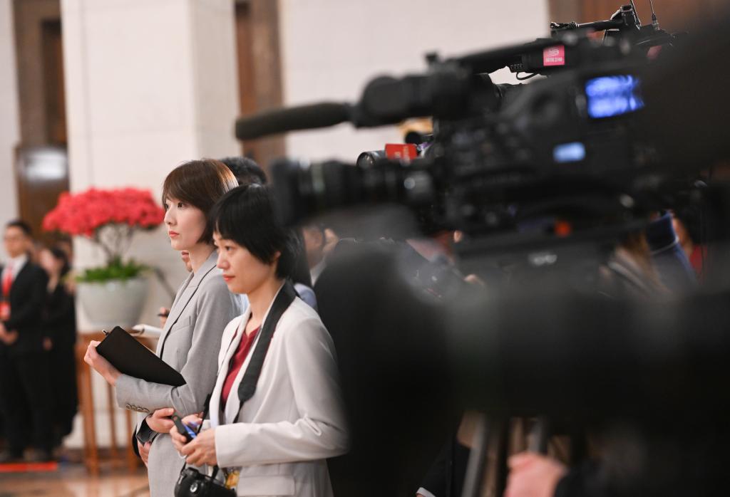 3月11日,第十四届全国人民代表大会第三次会议第三场“代表通道”集中采访活动在北京人民大会堂举行。这是记者在现场采访。新华社记者 陈晔华 摄