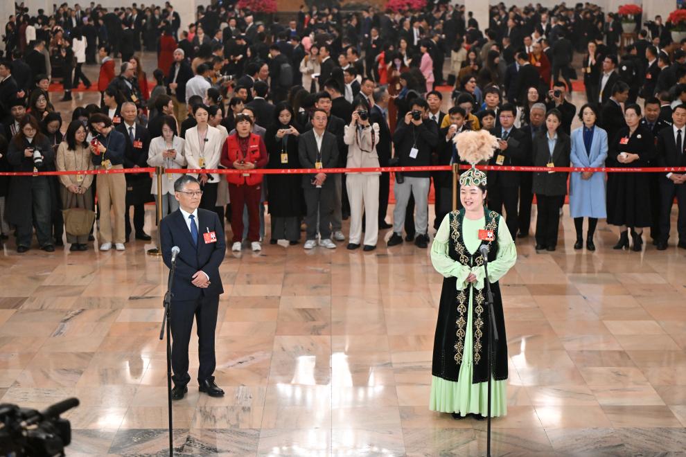 3月11日,第十四届全国人民代表大会第三次会议第三场“代表通道”集中采访活动在北京人民大会堂举行。这是全国人大代表卓娅·巴合提接受媒体采访。新华社记者 胥冰洁 摄