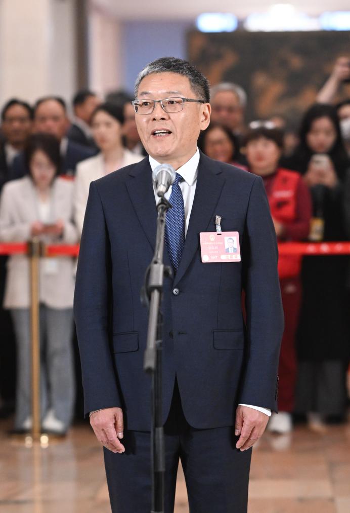 3月11日,第十四届全国人民代表大会第三次会议第三场“代表通道”集中采访活动在北京人民大会堂举行。这是全国人大代表李东林接受媒体采访。新华社记者 李笑 摄