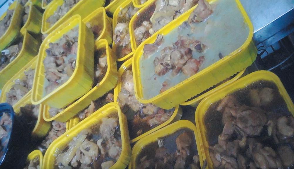 没有经过任何保鲜措施的隔夜发黑黄焖鸡,直接加热出售。 图片/新京报我们视频截图