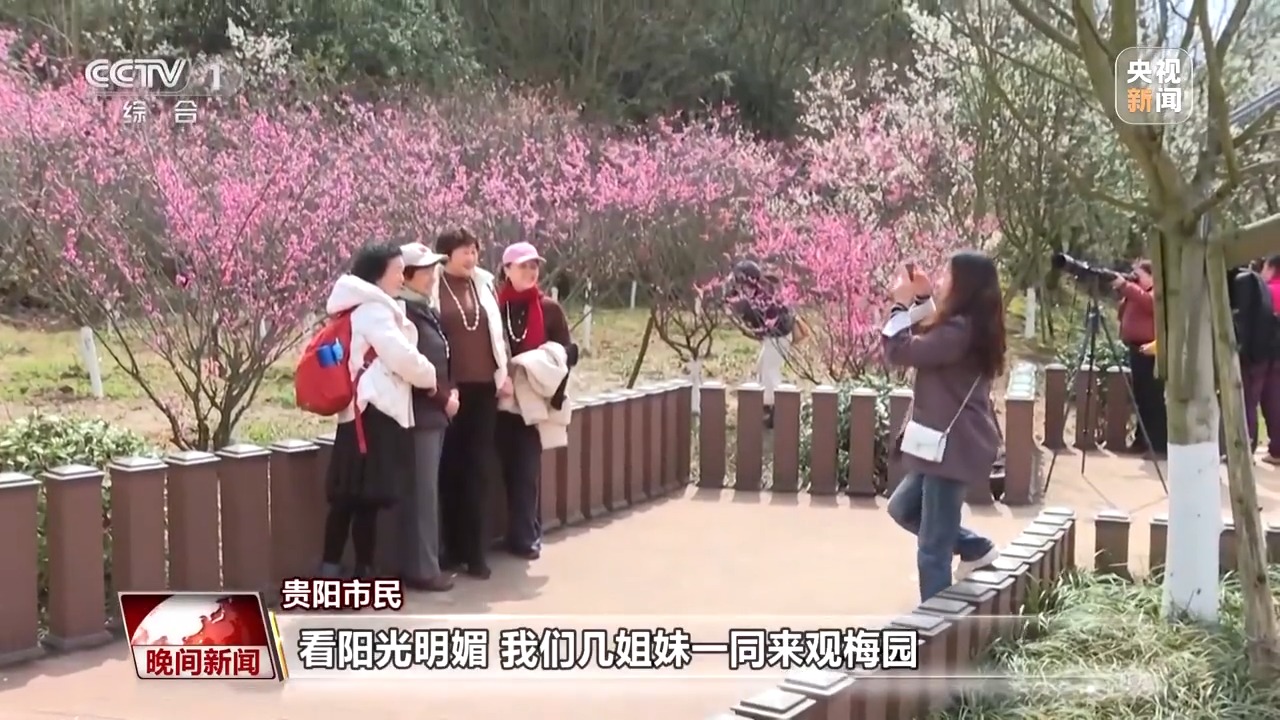 在贵州贵阳的观山湖公园,大片梅花渐次绽放。阳光下,梅花三朵一簇,五朵成团,犹如粉红色的宝石镶嵌在树枝上,吸引市民游客前来打卡拍照,共同感受春日的美好。