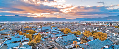 航拍丽江古城。