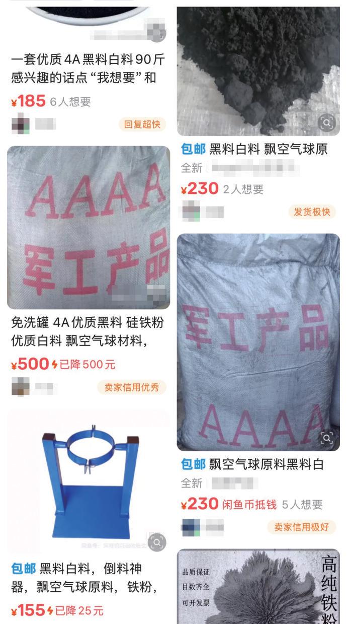 新京报记者搜索发现,电商平台上售卖的实验用铁粉大多要十几元到几十元一斤,相比之下氢气球材料包里的“黑料”便宜很多。不过,在电商平台直接搜索“黑料”“白料”,也有平均每斤2元出头的“铁粉黑料”在售,店铺客服告诉记者用途是冶炼,但这些店铺内销售的商品也都是与“飘空气球”相关的。