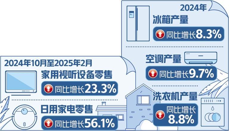 家电消费是我国居民消费的重要组成部分。按照党中央、国务院决策部署,消费品以旧换新工作加力推进,取得显著成效。家电消费市场自去年下半年以来持续回暖,商务部数据显示,2024年8月至今,消费者购买以旧换新家电产品近9000万台。增值税发票数据显示,2024年10月至2025年2月,电视机等家用视听设备、冰箱等日用家电零售同比分别增长23.3%、56.1%。在生产端,家电产量、利润均呈现增长态势。2024年,冰箱、空调、洗衣机产量同比分别增长8.3%、9.7%、8.8%。家电行业利润总额同比增长11.4%。
