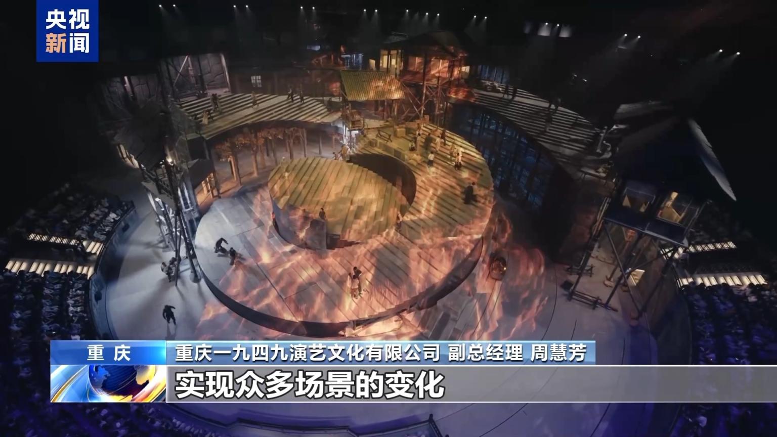 重庆一九四九演艺文化有限公司副总经理 周慧芳:我们打造了独创的多维立体沉浸式旋转舞台,通过5个可以360度独立旋转的圆环,实现众多场景的变化,在同一时间演绎不同空间的故事。