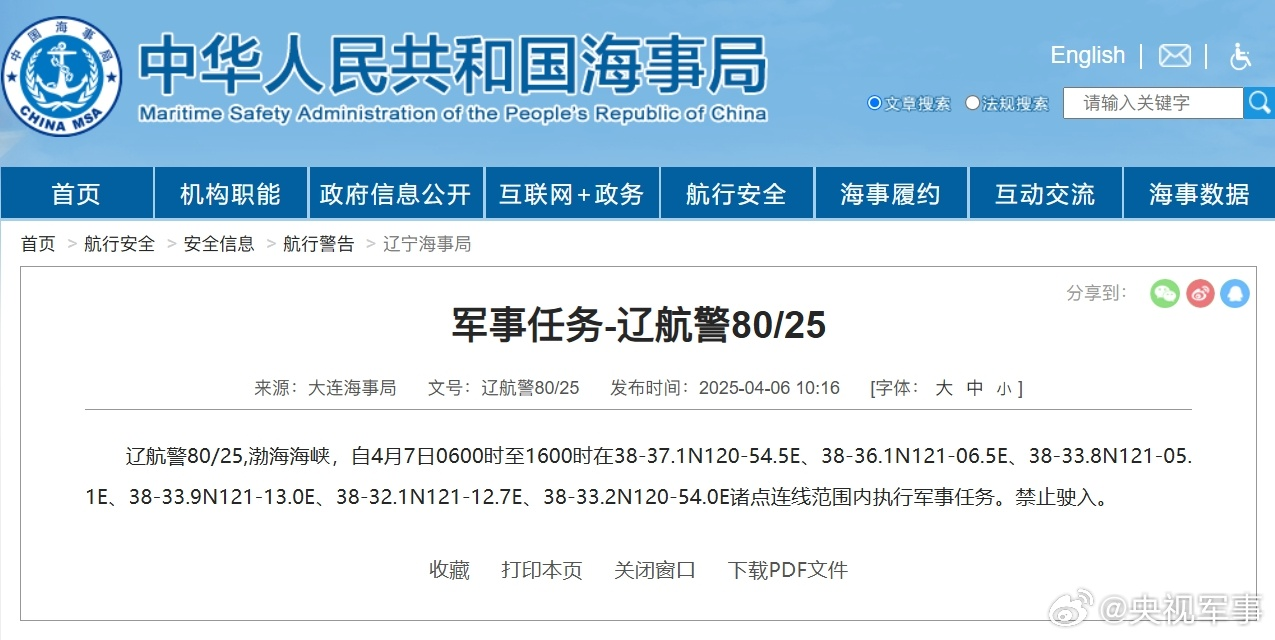 来源标题:航行警告!渤海海峡部分海域执行军事任务 禁止驶入