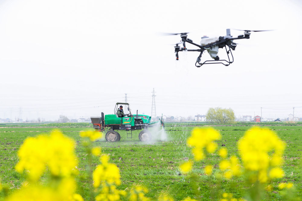 近日,在江苏省兴化市陈堡镇蒋庄村,农民驾驶植保无人机、自走式喷杆喷雾机实施杂草防治作业。 新华社发(周社根 摄)