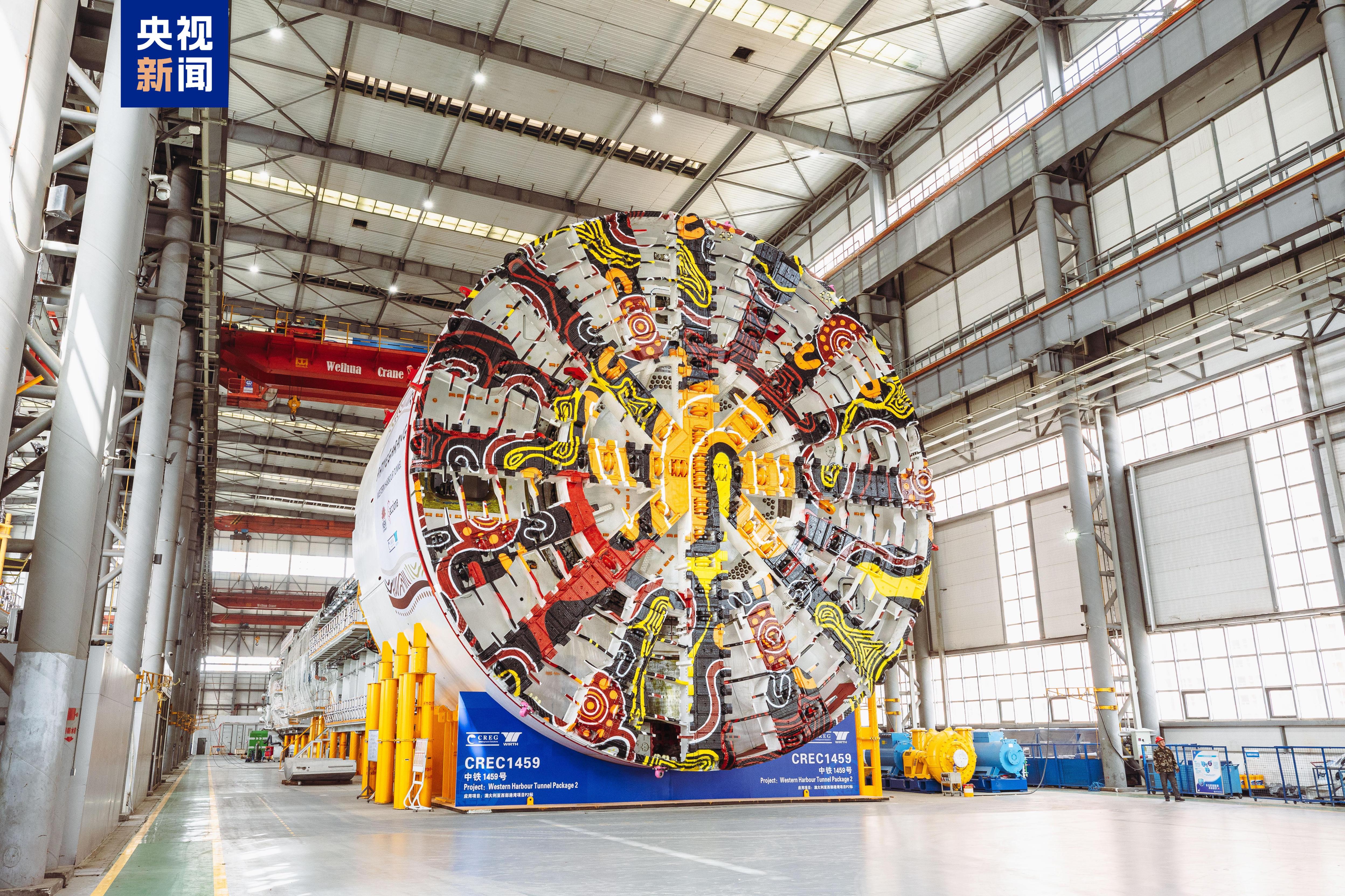 这台刀盘涂装着澳洲本土图腾文化图案的盾构机,开挖直径达15.7米,相当于超5层楼的高度,整机长度约113米,是目前中国出口海外最大直径盾构机,整机集成多项智能化技术。