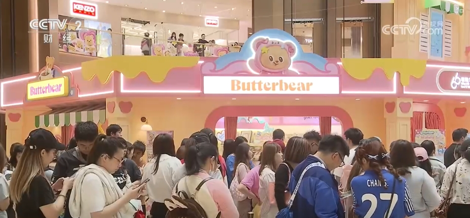在上海一家大型商场的广场上,来自泰国的黄油小熊正是这个周末最火的明星,从中庭快闪店前的蛇形长队就可见一斑。店内,上海首发限定款白玉兰挂件和摩登波点挂件,兼有城市和IP双重元素,成为必买商品。为了限流,店里每20分钟放入一批顾客,还有人拖着拉杆箱来扫货。