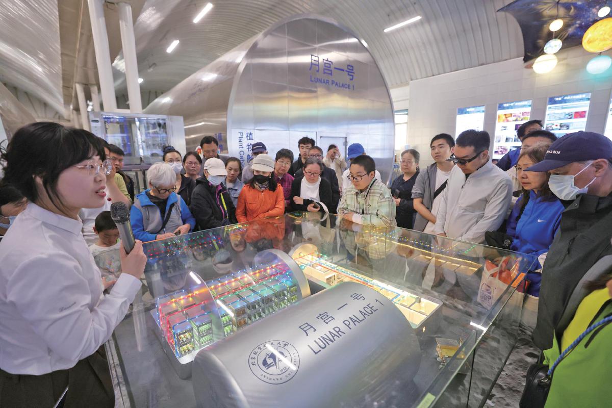 为了让公众更好地了解基地,北京航空航天大学在现场安排了志愿者导览,生物医学工程专业博士二年级学生侯思瀚便是其中之一。“大家问得最多的问题还是我们什么时候可以登月、上月球生活。”侯思瀚笑着说道,他给大家讲解了我国的登月规划以及科研人员的努力。