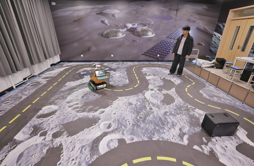 据介绍,这一教学平台覆盖了“星球车虚拟设计-仿真测试-星球车实体设计-星球实景”全链条学习过程,实现了“虚拟现实VR平台、混合现实MR平台、虚拟仿真平台、实体平台”四类平台的有机融合。记者现场体验发现,“虚”是指学生们可以在线上利用数字教材进行数字化学习、虚拟实验,操控虚拟月球车;“实”是指这里不仅依比例还原了月球表面的原始场景,还搭建了供月球车行走的轨道,使学生可以进行越障、避障、自主导航、路径规划、智能感知等实验。而一侧墙面上的“2035年月球科研站”的规划图,让学生们对我国未来探月工程有了使命感和责任感。“在这种沉浸式的教学平台进行学习和科研,学生有了更加浓烈的兴趣和身临其境的沉浸感。”崔勇说道。