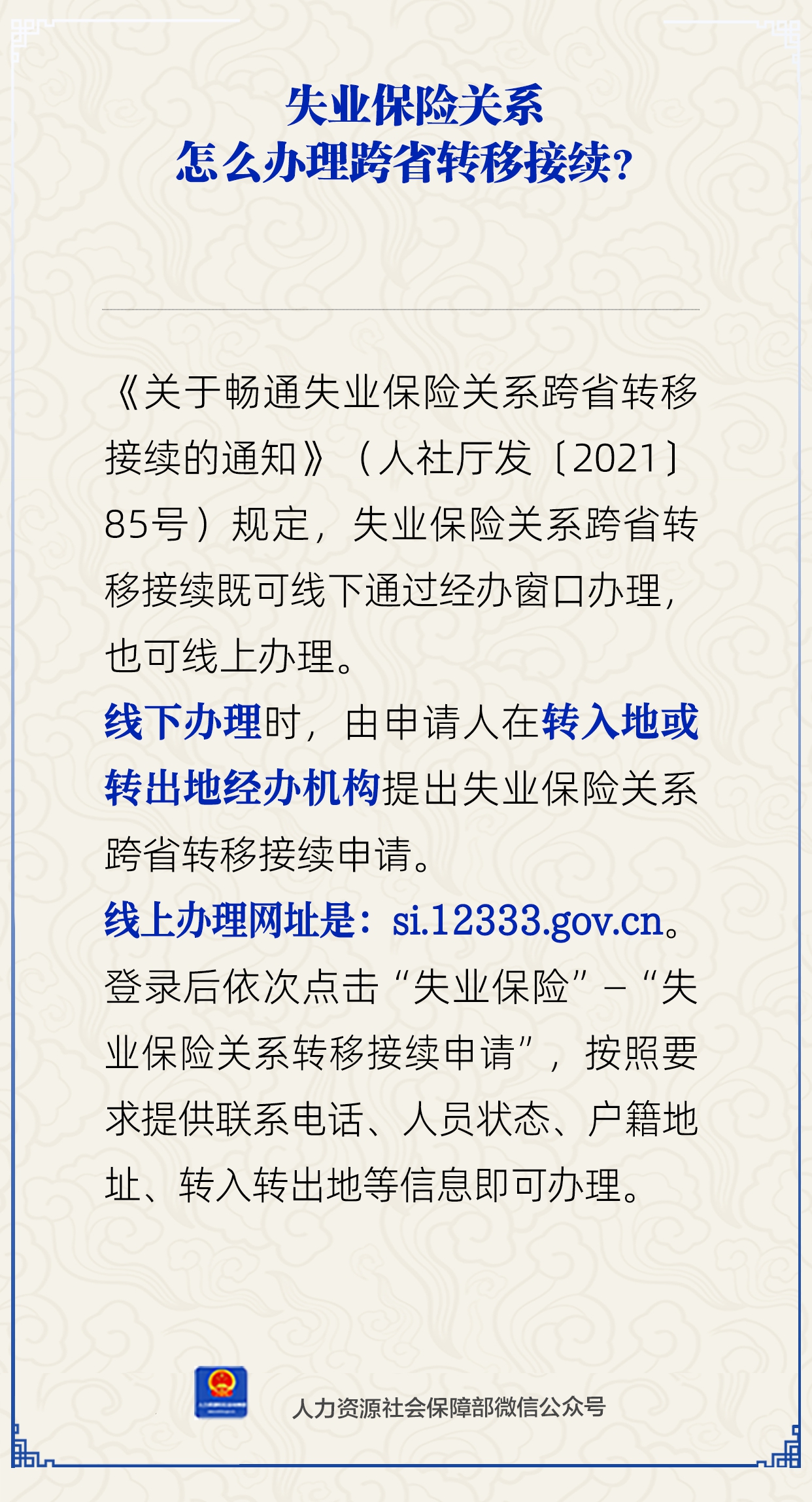 据人力资源和社会保障部微信公众号消息,失业保险关系如何跨省转移接续?就这一问题,人力资源和社会保障部回应称,《关于畅通失业保险关系跨省转移接续的通知》(人社厅发[2021]85号)规定,失业保险关系跨省转移接续既可线下通过经办窗口办理,也可线上办理。