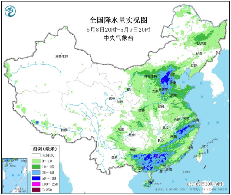 看看实况,这雨确实下得不小。过去2天,中东部出现了大范围降雨,其中昨天,北京、河北、山西共24个站点降水量打破5月单日纪录,河北涞源和徐水,还创造了当地最早大暴雨日纪录,首次在5月出现了大暴雨。
