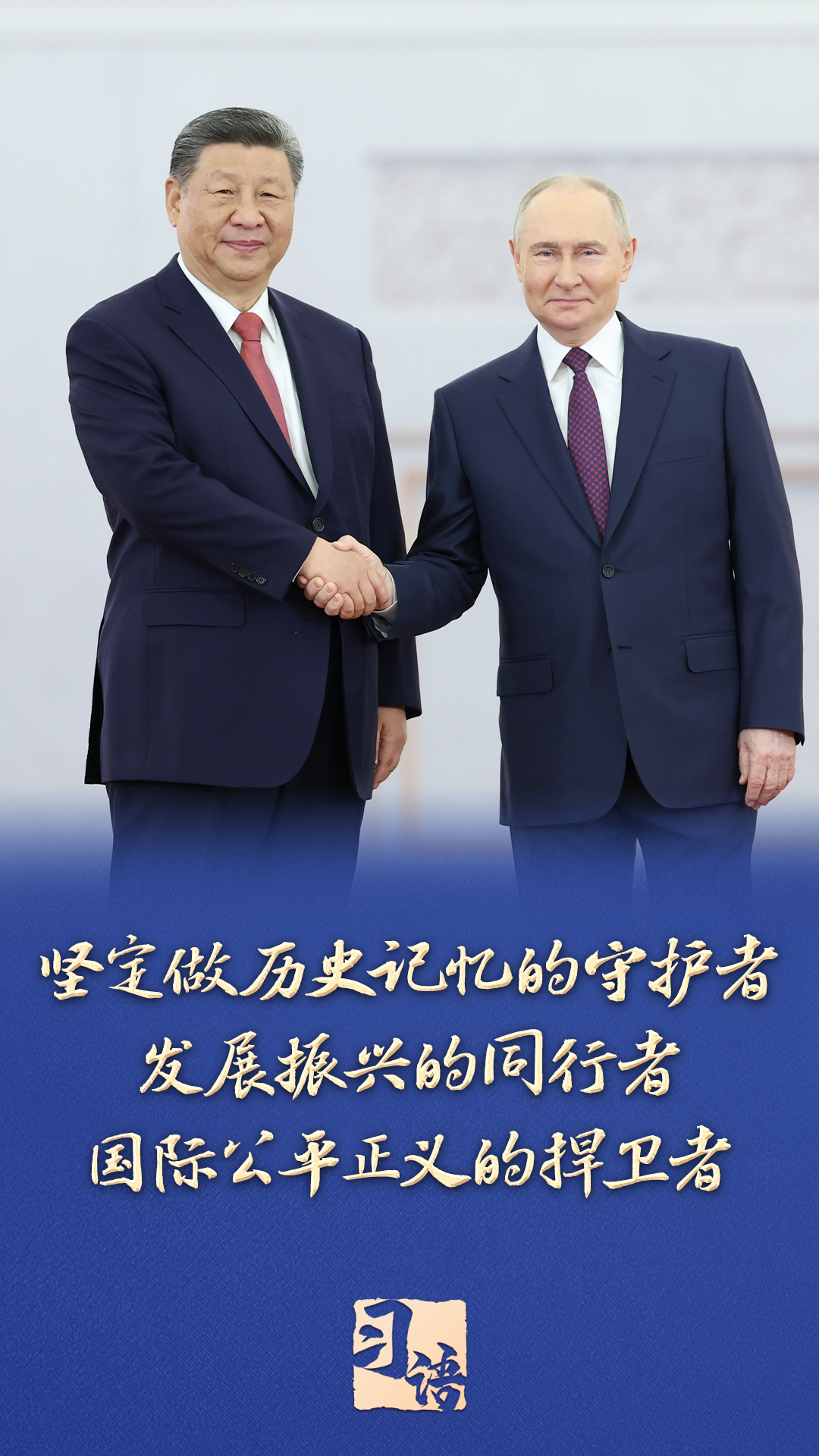 “80年前,中国人民和俄罗斯人民为世界反法西斯战争胜利共同作出了不可磨灭的历史贡献,用鲜血凝成牢不可破的伟大友谊,为两国关系高水平发展奠定了坚实基础。”