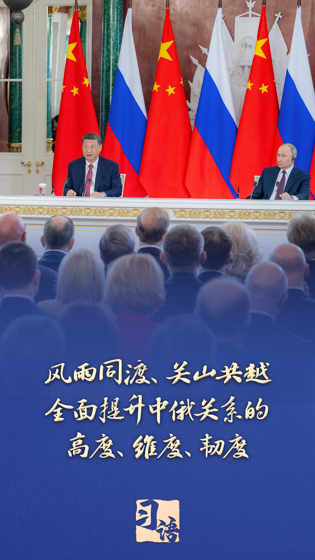 “面对变乱交织的国际形势,中俄两国要坚定秉持永久睦邻友好、全面战略协作、互利合作共赢精神,风雨同渡、关山共越,全面提升中俄关系的高度、维度、韧度,为世界和平和安全注入更多稳定性,为全球发展繁荣提供更强推动力。”当地时间5月8日,习近平在同俄罗斯总统普京共同会见记者时指出。