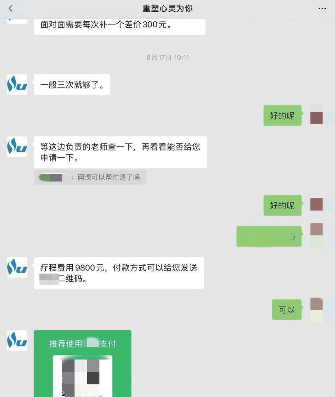 赵喆的经历类似。她提供的聊天记录显示,2024年,对接服务的心理咨询机构要求她预付9800元购买十次视频咨询服务。经过一番讨价还价,机构最终优惠了500余元费用。
