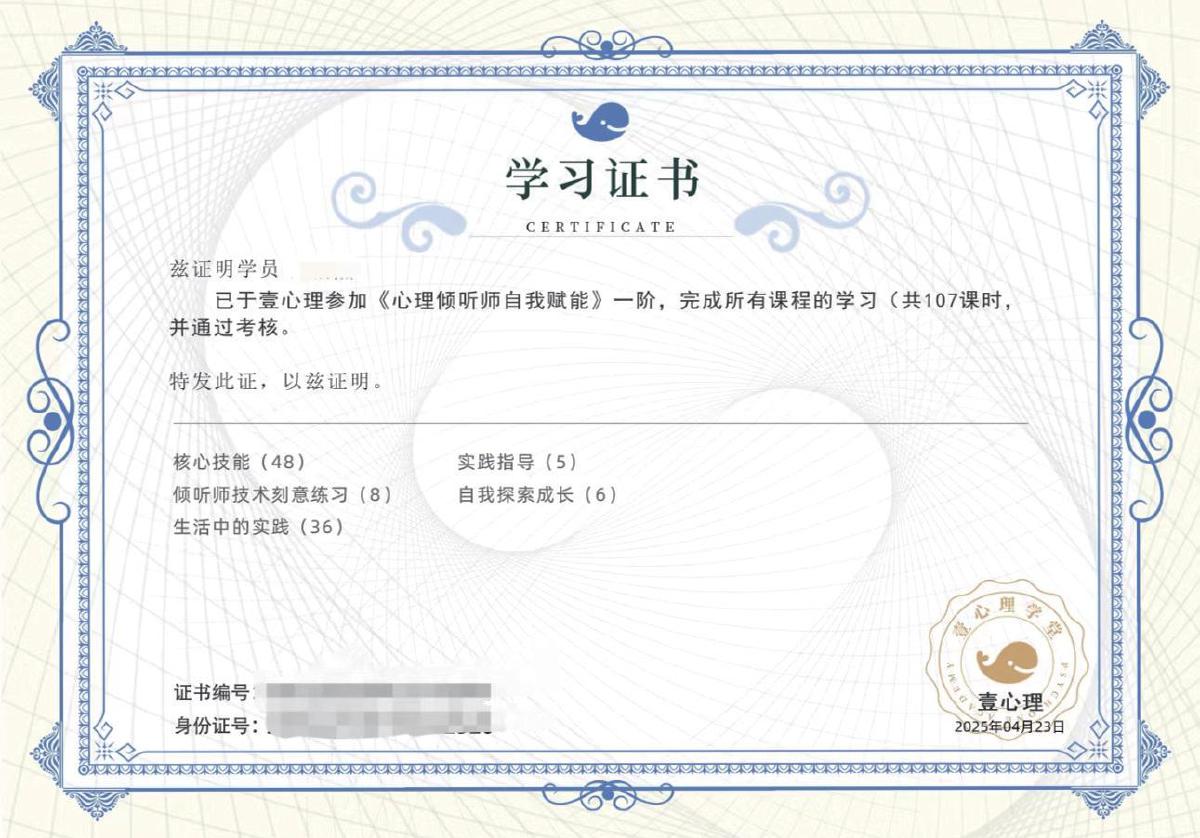 “壹心理”平台招生人员向记者展示的该机构培训学习证书。 受访者供图