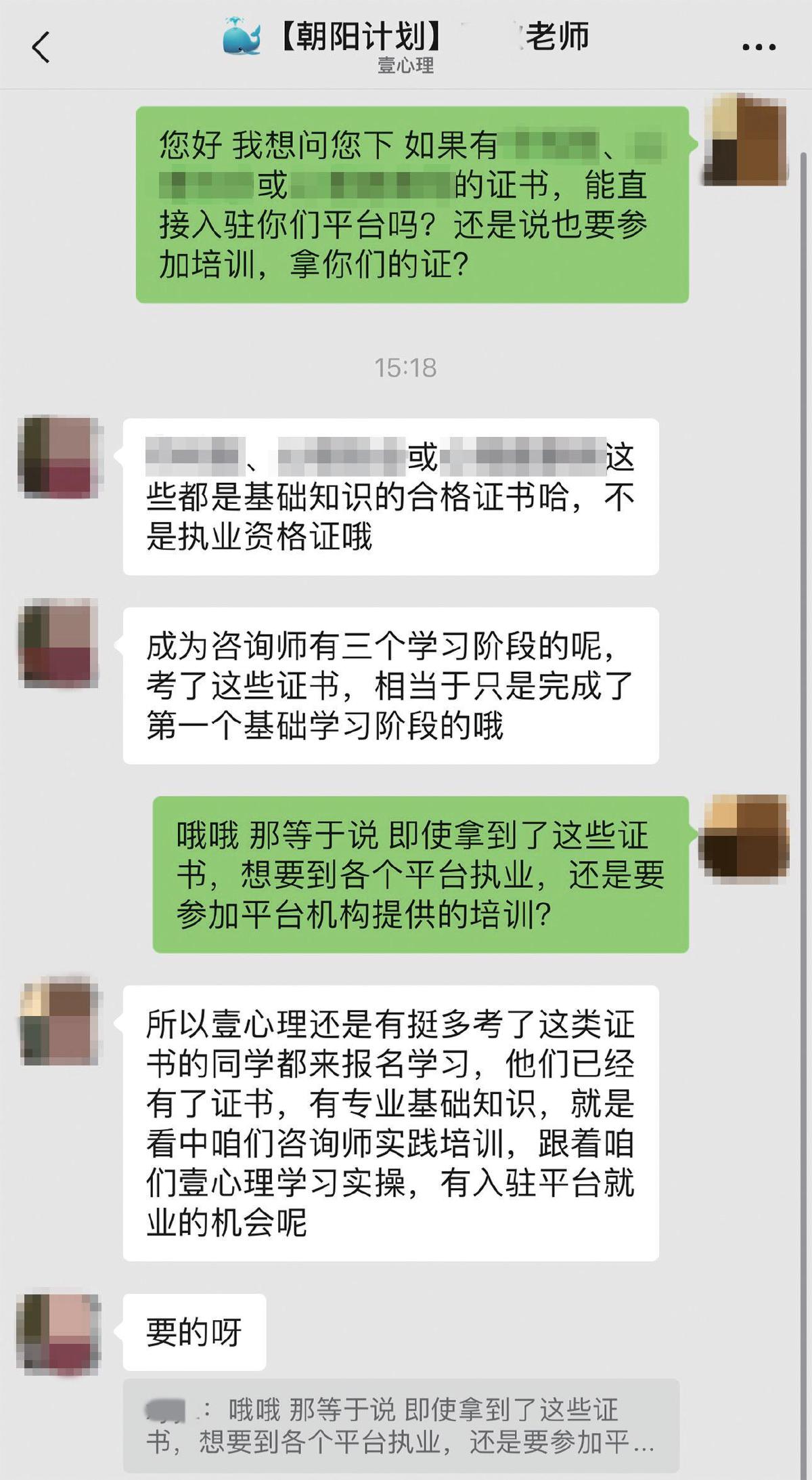 记者随后询问了5家心理咨询平台,其中4家表示只认可在本机构接受过系统培训的咨询师,即使持有其他机构颁发的证书,仍需接受自家平台培训才有机会执业。
