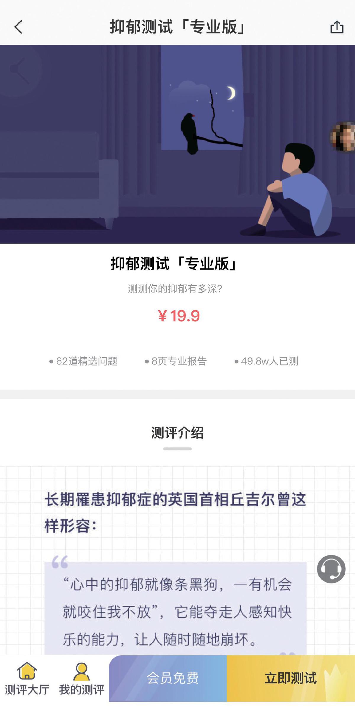 某线上心理平台推销的19.9元抑郁测试题。 线上心理平台截图