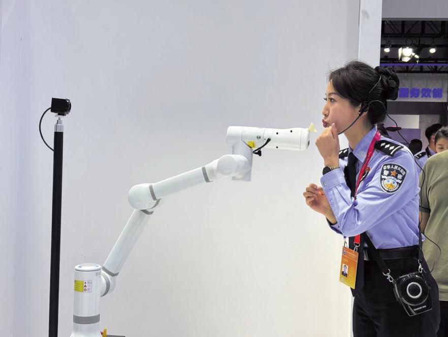 记者发现,不仅是智慧化无人装备展区,其他一些展区里也有无人化装备展出。如在交通管理装备展区里,有一款“酒驾初筛机器人”上展。该“机器人”的机械臂可以将识别酒精的传感器直接送到驾驶员的面前,并通过智能语音引导驾驶员完成酒驾初查检测。据解说员介绍,该智能设备每次检测仅需三五秒,单次工作时间长达4个小时,有效降低了交通民警的工作强度。