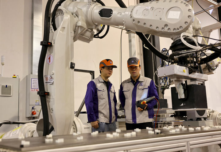 技术人员在上海交大智邦工业母机与智能制造共性技术中试验证基地内工作(2025年4月15日摄)。新华社记者 方喆 摄