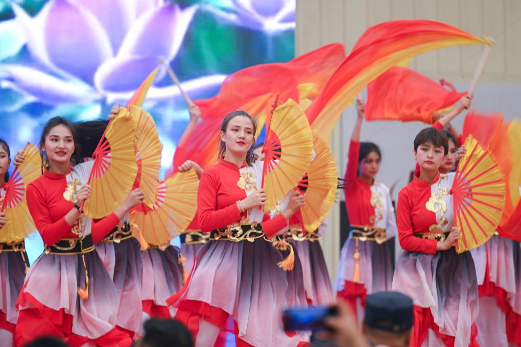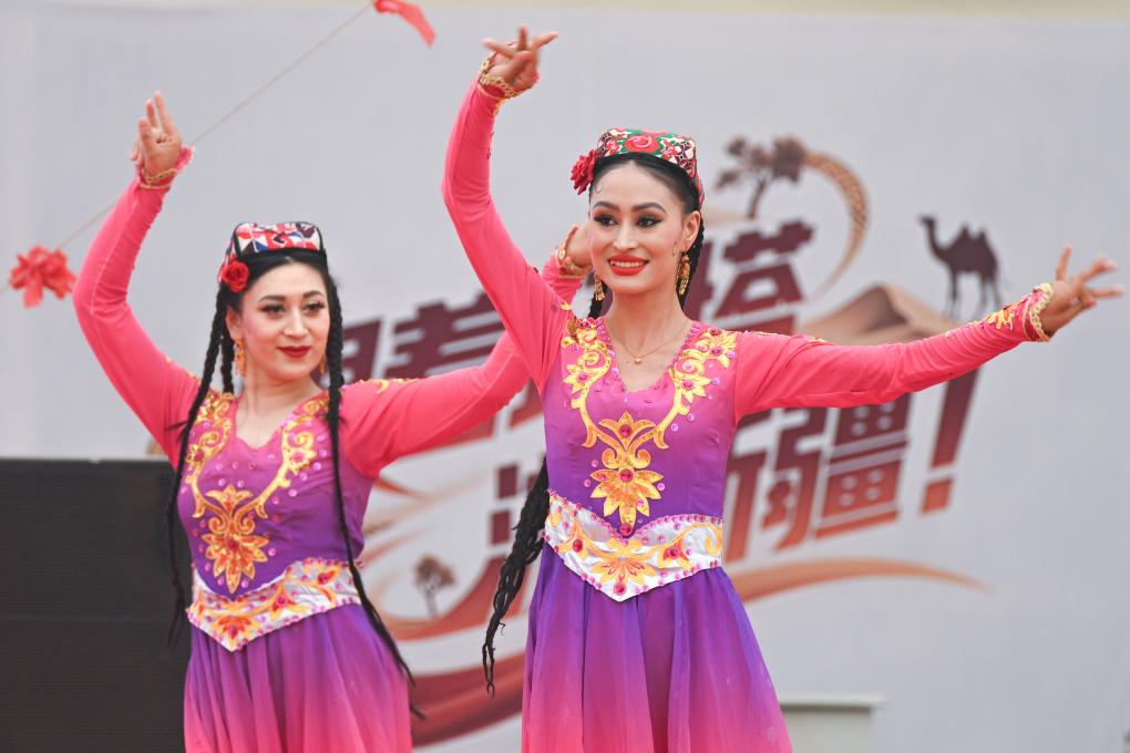 2025年5月28日,演员在2025中国环塔国际拉力赛新疆喀什地区叶城县赛段迎宾晚会上表演。新华社记者 辛悦卫 摄